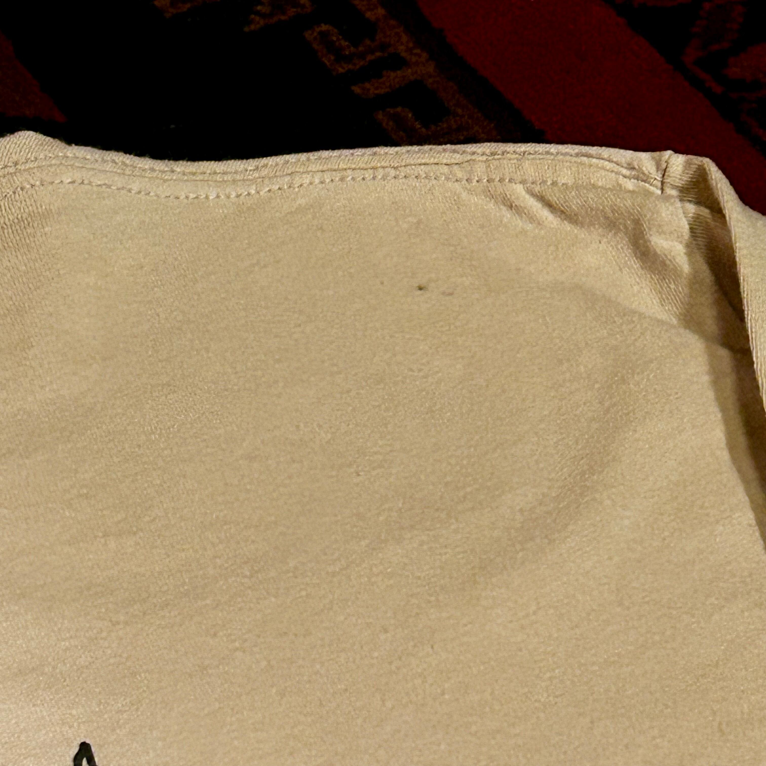色は画像では伝わりづらいですがオフホワイト〜ベージュです。所々シミ汚れあります。前後にプリントがあり良いデザインです。表示が無いのですが、たぶん綿100%と思われます。