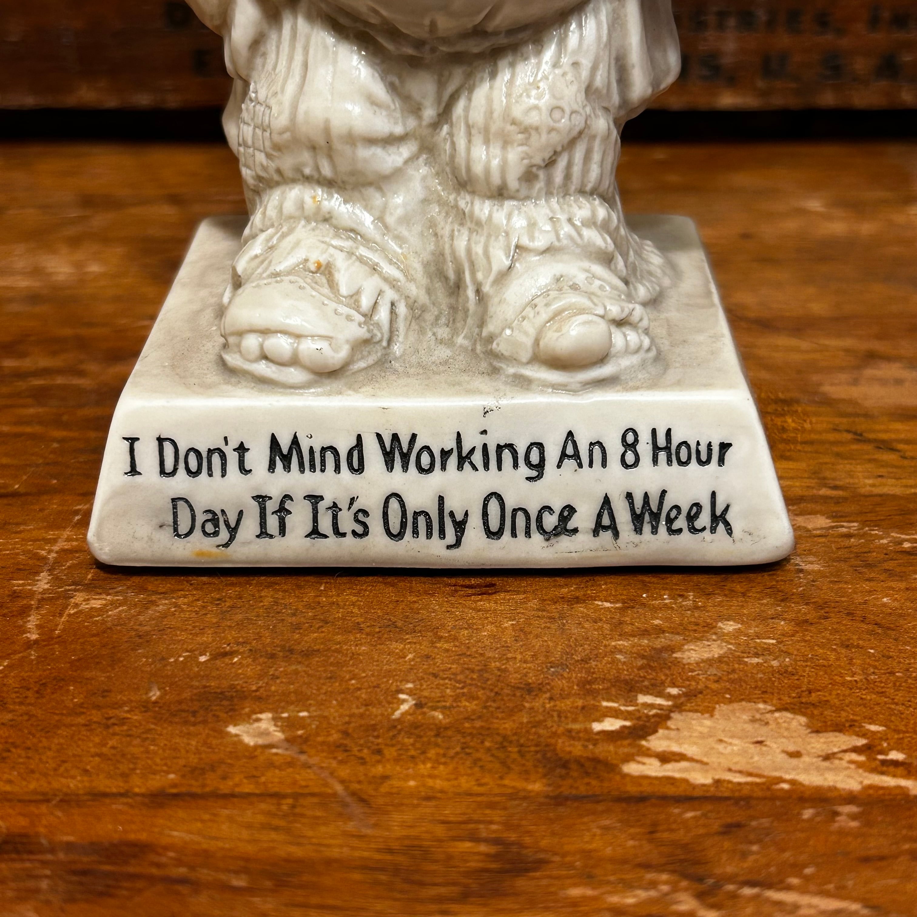 台座には「 I Don't Mind Working An 8 Hour Day If It's Only Once A Week」と刻まれています。